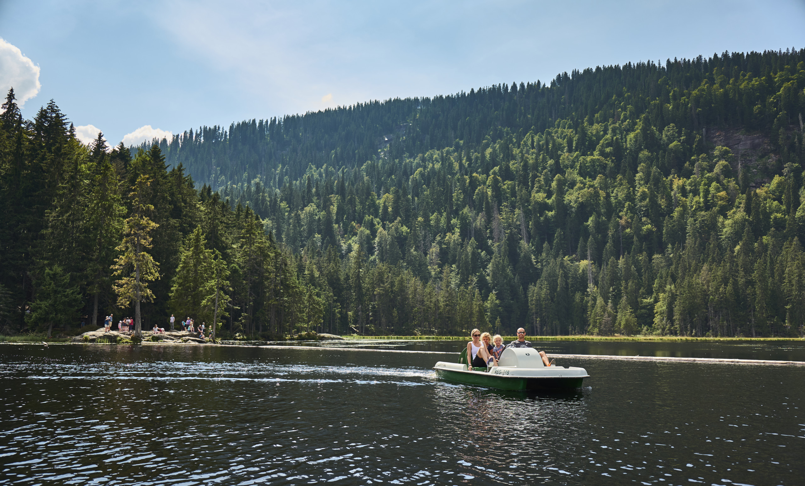 Auf einen wildromantischen Rundwanderweg entlang des Seeufers können Gäste die eindrucksvolle urwaldähnliche Flora und spannende Fauna am Großen Arbersee mit eigenen Augen erleben sowie viele spannende Informationen zur Geschichte, Entstehung und Natur nachlesen. Die Wanderung dauert in etwa eine halbe Stunde. Alle kleinen und großen Kapitäne können auch gern den See sicher und gemütlich mit dem Tretboot befahren.