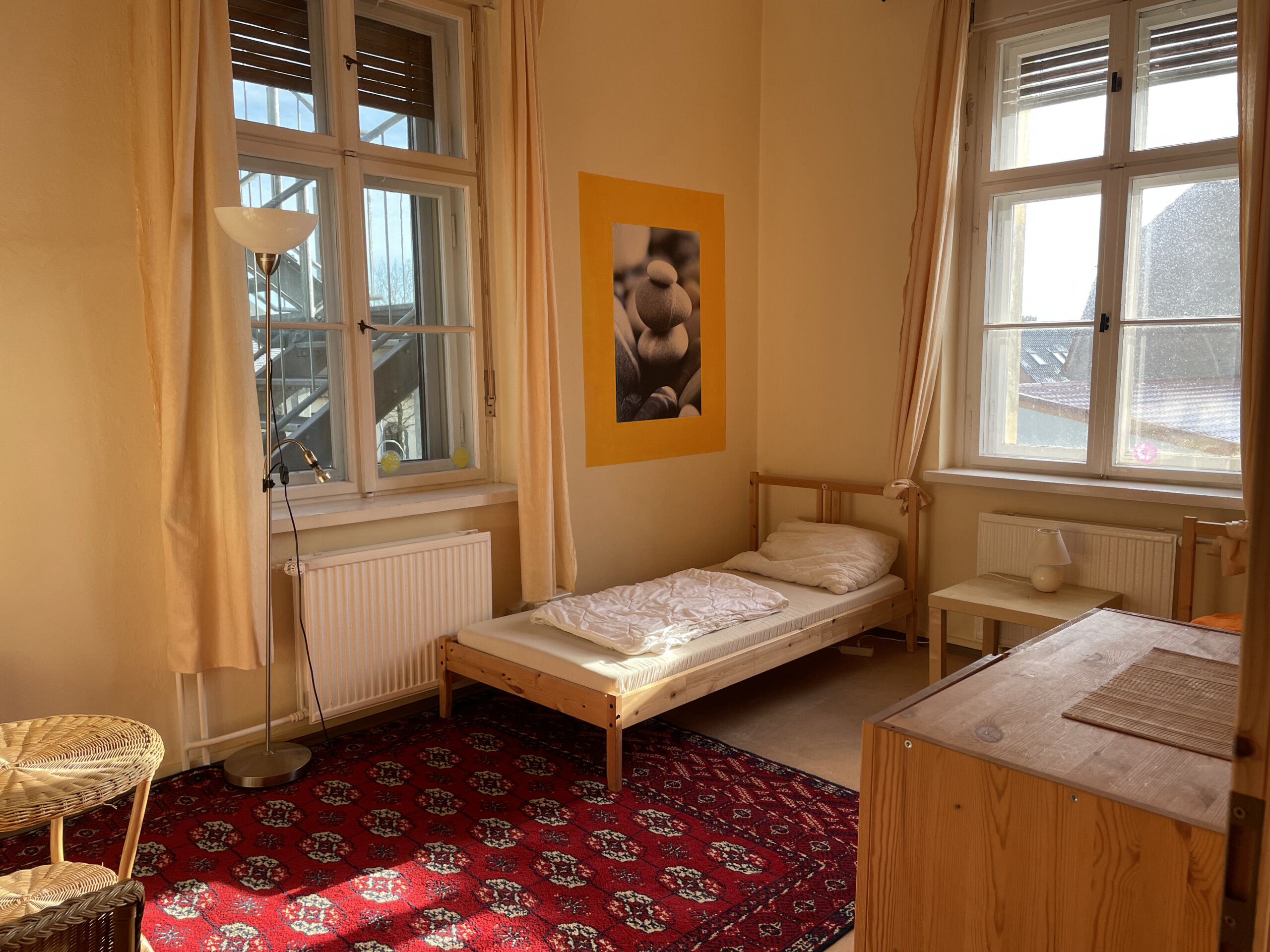für Yoga, Körperarbeit, Gesprächsrunden, zum Proben: Parkettboden, Kissen, Decken, Fenster, Mittagssonne